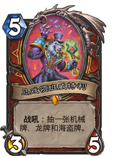 比如这张马戏领班威特利,他跟马戏领班的节杖一样,设计的过于保守。虽然可以定向过三张,但是五费上一个3-5的白板显然是节奏卡组无法接受的,就跟奇数瞎不会带深蓝系咒师一样。龙的新组件有帐篷摧毁者,这是一张好卡,即使455突袭也很强,甚至可以更低费上场。但是他会影响城镇公告员定向检索废墟之子和虔信狂徒。海盗的新组件吞剑艺人倒是让人眼前一亮,这卡本身超模1-2费,且攻防兼备,五血的嘲讽也是jk战所需要的。不但jk战可能带,也是海盗战的新玩具,大航海时代永不落幕!