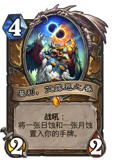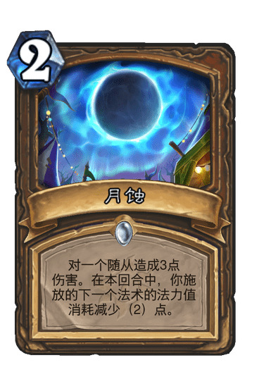 这次给德鲁伊的单卡大多比较笨重,唯一亮眼的就是这两张酷炫的二费法术了。先说说月蚀,它配合其他法术使用,本质上是一张0费打3,对比沼泽射线显然更加灵活。只可惜这个减费效果只是当回合,不能像自然研习那样存费用润滑曲线,否则就是神卡了。不过现在的德鲁伊二费往往没事情做,三费可以配合凶猛咆哮。而目狂野的组合技德已经多年不带愤怒了,如蓝龙德都是走快速跳费过牌,斩杀竞速的路线,因此卡组中难有它的卡位。