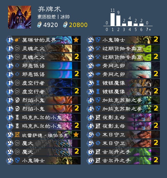 混乱套牌也是最近讨论比较多的卡。这是一张很有潜力的牌,术士版的口袋银河。这卡的比口袋银河的优势在于低一费,而且可以强化随从自身的属性,虚空领主变成了399,瑞文戴尔变成了147,还有一些冷门卡如莫什奥格执行者直接变身2费8-14的圣盾嘲讽。特化构筑之后**一张混乱套牌还是很虎的,只可惜血色绽放削了,不然上限会更高。而且术士的技能优势让其发挥空间更大,具体构筑冰帅还没想好,也许宇宙术可以**一张,希望小伙伴们集思广益,共同开发。