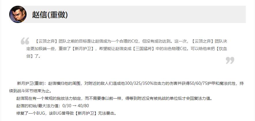 赵信解读:赵信重做,赵信史诗级加强,技能造成3-3.5倍伤害,且获取双抗,无限叠加。只要释放2次技能就可以获得超高坦度。且技能回蓝只有1秒左右的法力锁定,有挑战者的时候也可回蓝。版本又1神卡诞生,无论在三国体系还是决斗体系中,都是可以决斗主C的存在。