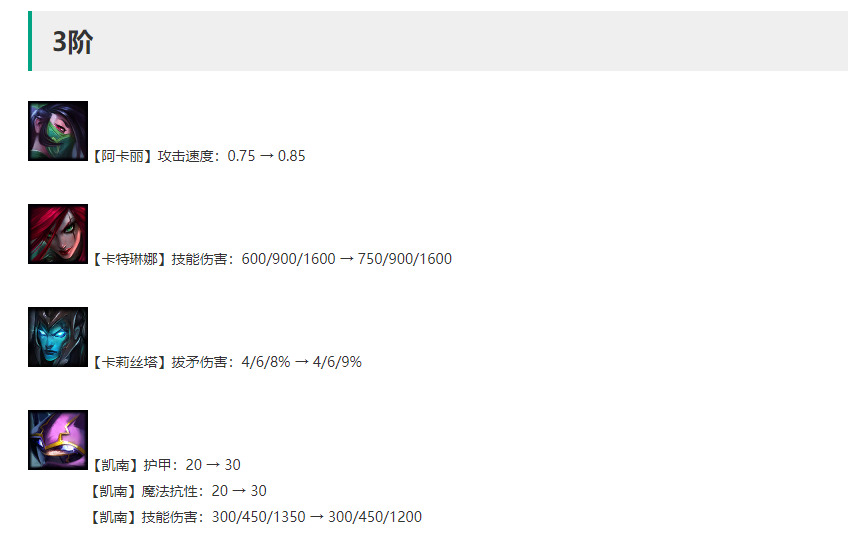 卡特琳娜解读:1星技能伤害增强,此番做的目的摩昂觉得就是1星卡特释放技能可以对3星龙牙塔姆造成伤害了,不在是格挡。1星技能增强还有个好处就是,打工增强,卡特打工思路可看我上一篇神盾运营思路。