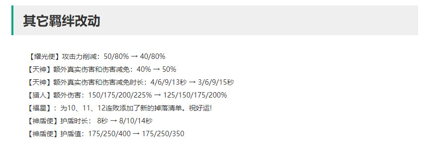 天神羁绊真实伤害与伤害减免再次归来,50%的真伤,让在10.22版本疲软的天神再次硬了起来,坦度提升巨大,真伤增强,3星拉克丝又可以秒一串人了;2天神持续时间被削弱1S,让单挂2天神的强度与10.22版本相当于持平,4-6天神羁绊不变就属于加强,而8天神的持续时间达到15秒,但大部分对局很少结束到20秒以后,提升较弱。