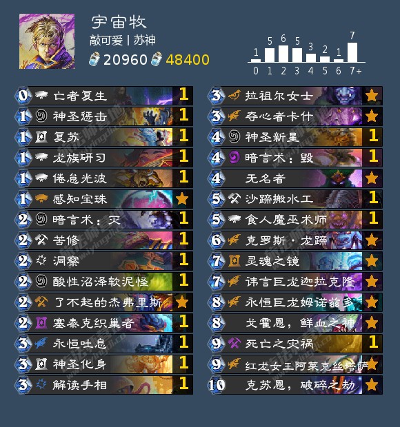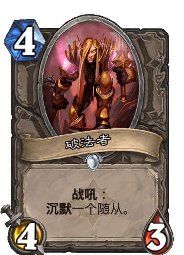 新卡只有4张,下面谈谈旧卡。很多时候宇宙牧需要根据环境携带针对卡,下面具体讲讲软以及食人魔巫术师。在预览其他职业卡牌的时候(作为牧师嘛,当然要看看其他职业有什么),我就发现新版本跟武器相关的卡组特别多,再加上瞎子新卡的强悍冲击力(比如什么吸血改成打脸啊,343的刀啊),在结合当前版本跟残片瞎斗智斗勇的经历,我认为新版本瞎子仍然是最值得针对的对象。小软就不多说了,下面说说食人魔巫术师。我记得这张牌已经出道很早了,被人拿来针对瞎子跟奇迹法这两个需要靠法术解场的卡组。尤其是这张牌对瞎子的威慑力非常大,最次吃一个沉默,很多时候能换瞎子很多资源,因为瞎子不解537就不能打我的脸。但是我在前几天打天梯的时候碰到Xc大佬,据当时看直播的小伙伴跟我说,Xc看到我4费硬币537的时候惊呼“他带这张牌有什么用啊?!”然后卡了Xc祈求贼的一张幻觉药水,不过我当时不知道他带这个。这说明537这张卡的应用范围还不太广,我应该继续大力推广一下。并且537这张卡针对瞎子,但是也并不是只针对瞎子。只要牧师空场拍一个537,什么职业都得稍微头疼一下。也就是针对到瞎子血赚,碰到别的职业不亏。
