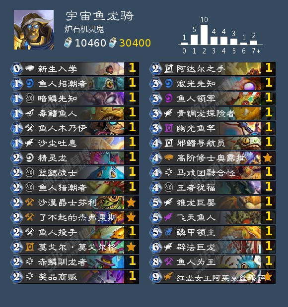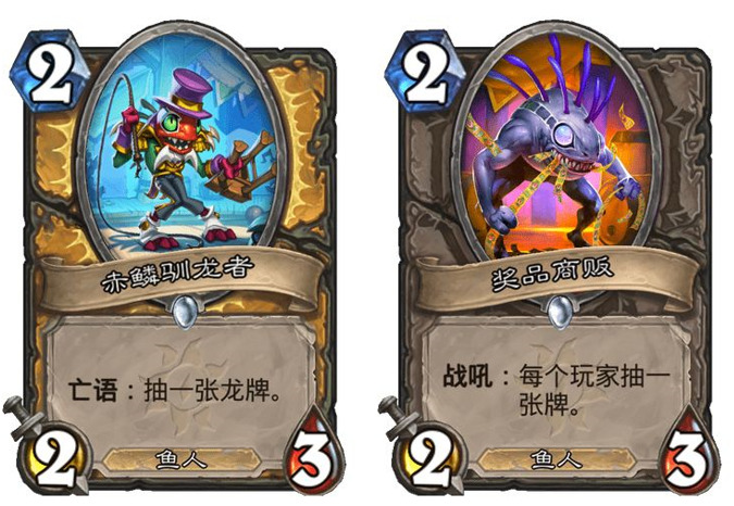 补强单卡:这个版本中,赤鳞驯龙者和奖品商贩的加入我认为是极度润滑了鱼人的2费曲线,两张鱼人不仅都是稀缺的23鱼人极其扎实属性,给阿达尔之手提供了更多载体,在鱼人中永远是生命大于攻击力的鱼人更吃香,同时他们还能提供这类骑士套牌中非常需要的过牌功能,可以说是同时极大补强了前期和中期润滑度,回想起来,上次23鱼人的石塘猎人在环境中时,乌瑟尔先生还是T1,同时新卡马戏团融合怪的加入可以同时作为鱼种和龙种,看起来还是挺不错的,再者仅有的几张法术配合高阶修士奥露拉配合鱼人为王也能打出更高上限。同时新版本的三张鱼人都是高质量续航牌,也增加了幽光鱼竿的质量。融合怪和鱼人魔术师则使得飞天鱼人的期望上限更高。一共携带了7条龙加上赤磷驯龙者可以理解为8条,根据以往的经验是绝对会有龙种,这里的卡位可以减一条龙就给环境卡。