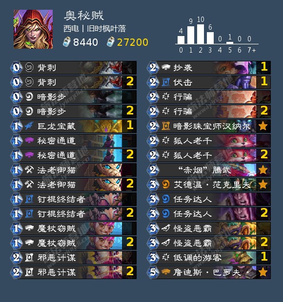 上版本奇迹法较多时奥秘贼满编抄袭,我认为无可厚非,但在中后期奥秘贼如果抄过一些其他职业的牌很容易导致手牌较为笨重,这是盗贼最不想看到的情况之一,因此在环境未定的情况下我选择只带一张抄袭改为一张伏击。