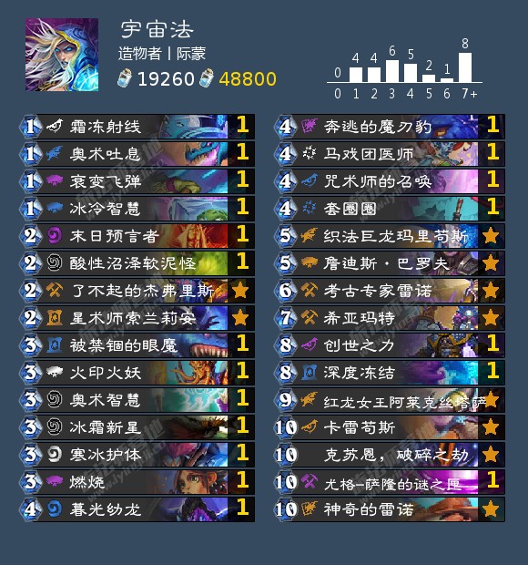 这套宇宙法整体上依旧延续了防守反击的思路,卡组中有不少都是老卡,所以这里我主要介绍的是新卡的取舍。我这套卡组一共只携带了三个新卡:马戏团医师、套圈圈和克苏恩,破碎之劫。马戏团医师强在灵活,可以回复也可以补刀,甚至可以用来斩杀。套圈圈这张牌和奥秘体系的契合度极高,在前期的操作过后,对面其实很容易发现我们是控制流法师并顺推出我们是宇宙法,带且仅带一个寒冰护体、一个火焰结界,然后就可以很好地防奥秘猜奥秘,但套圈圈可以拿到套牌之外的奥秘,灵活而且更具欺骗性;而且另一方面,有不少奥秘只能针对部分对局,比如说非公平游戏、寒冰护体,自己带的话很容易就成为废牌,但用套圈圈找的话就很不错。而且我们的卡组曲线很高,套圈圈挺容易被腐蚀的(马戏团医师同理,但是我们可能不总是希望它被腐蚀······)。克苏恩·破碎之劫可以当做这套卡组一个后期的终结点,四个碎片对于控制卡组来说也能提供不少解场资源。