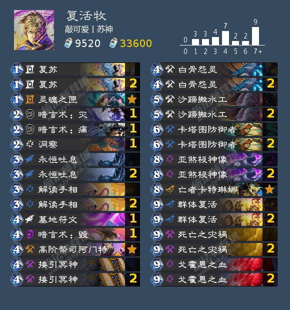 新版本设计师推出了亚煞极神像以及戈霍恩之血这两张牌,想拯救一下标准的复活牧。但是说实话,这两张牌费用可是太高了……为了让牧师活到八九费,复活牧的随从我选择还是以回血和墙为主。这样可以更好的过度到后期。新补强的戈霍恩之血可以看成是可以带两个的亡者卡特琳娜,增强复活牧的后期能力可以让复活牧不再特别依赖群体复活,增加厚度可以让牧师彻底放弃携带任务的想法,因为任务本身也是增加厚度的一种方式。当我构筑出卡组以后,有人认为携带魂匣会影响复活质量。(枫叶注:没错正是在下)我认为这套牌中,复活牌占整套卡组的比例是三十分之四,也就是只会影响大复活和接引冥神。我上面刚刚论证完复活牧不是特别依赖大复活了,所以大复活中出一个魂匣我认为很多时候可以接受。下魂匣的确会影响接引冥神的质量,然而复生随从死掉后的复活概率是魂匣两倍,即使真复活到魂匣也可以完成前期赖场的任务,还能洗进去两个终极我觉得也不亏。我认为复活牧最危险的时候就是在前期,在自己没有放出一堆墙的时候被抢死,所以带上一个魂匣让自己前三费有点事做是可以的。另外魂匣如果被亚煞极神像拉出来就是个自带吸血的10-10,被戈霍恩之血拉出来就是5-5的吸血都不亏,终极被拉出来还能带个魔免。因为这个魔免,我觉得也应该把魂匣带上。