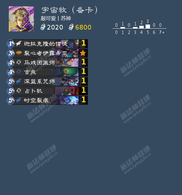 最后谈一谈备选单卡,由于新卡加入,祈求组件被我剔除了。因为即使带了祈求组件,jk仍然大概率没升级就变了,更多时候技能提供的资源更加关键。裂心者建议等各个职业套路成熟了以后再决定加不加入,没做到知己知彼,裂心者很可能坑到自己。吉兆算是一个补质量的比较娱乐的卡?尚不知道它的具体强度,如果真的很强可以考虑带,不过我感觉这种卡发现出来比自己带要好。占卜机跟吉兆差不多,通过技能点出来比自己带更好一点。马戏团医师是我看遍了中立卡以后觉得最能加如宇宙牧的单卡。要奶要伤害可以自己选,并且不需要配合,还算灵活。老朋友深蓝系咒师与解读手相的相性比较好,如果不想带537的话,带回咒师是一个比较好的选择。