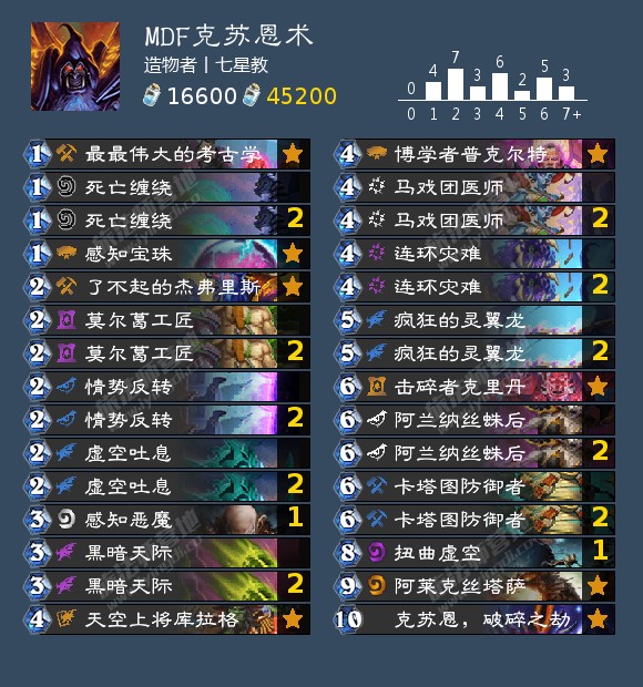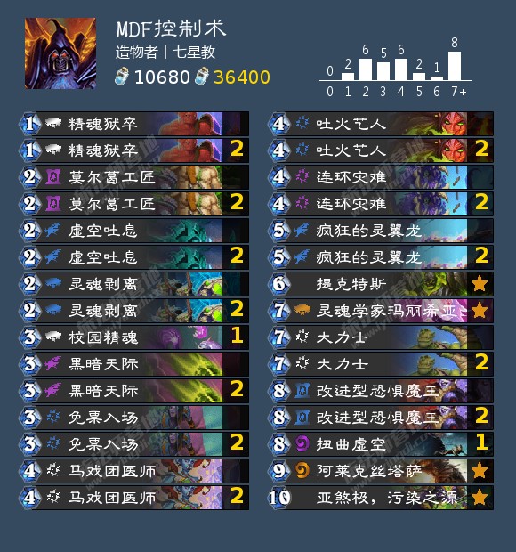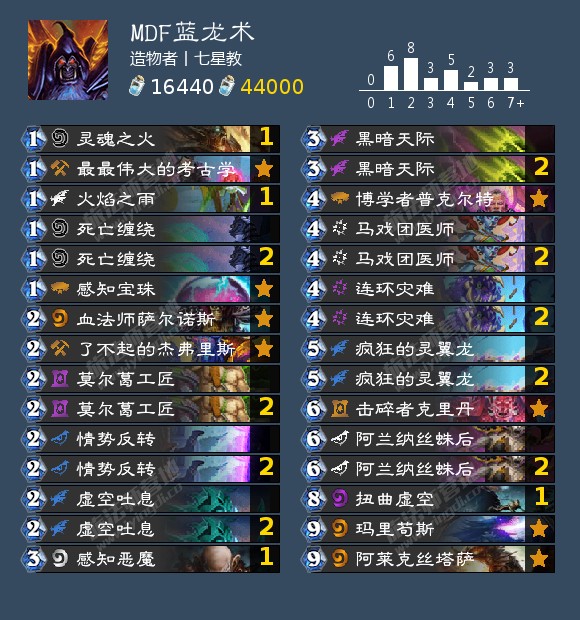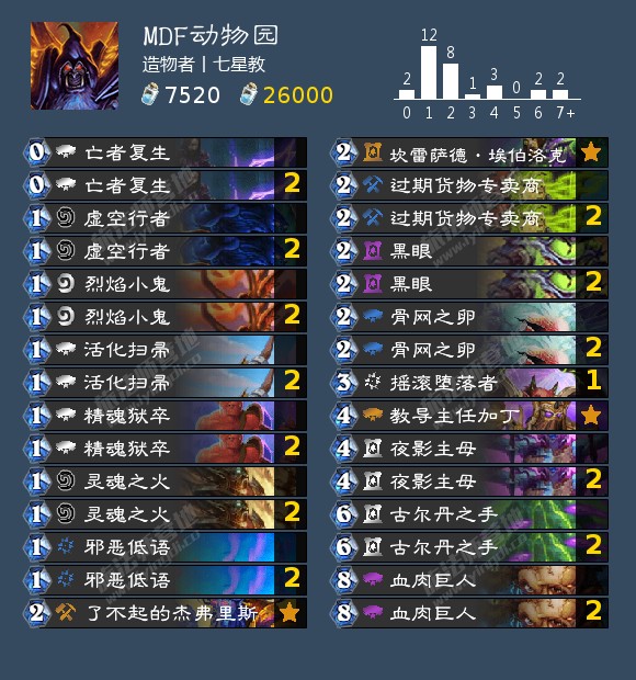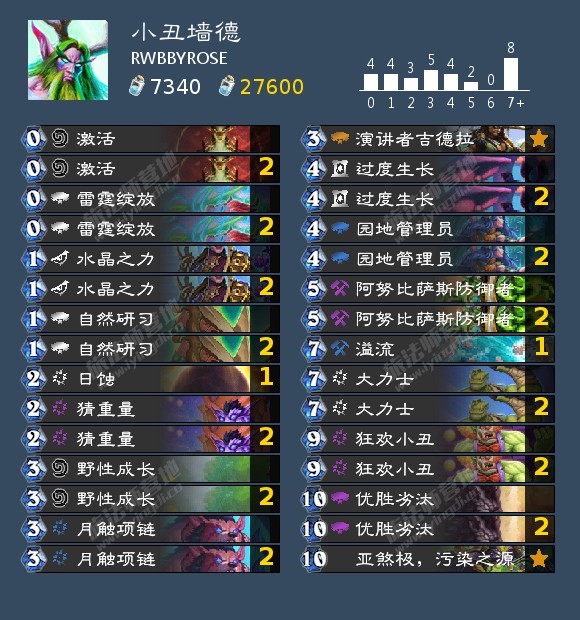 当时我对小丑德的看法是。。。鸡肋,打完优胜劣汰后一地88嘲讽的场面固然恐怖,但这要求德鲁伊十费裸打一个优胜劣汰,基本相当于空过一回合——我知道535和大力士是为了解决这个问题,但那又要求德鲁伊能保证手牌质量的前提下安然度过到十费,这对这个自古以德胡人的职业来说实在太吃羁绊了些,往往是打快攻不需要小丑都能赢,打控制控制又有多种方式能解光,再比如碰个飞刺暗影步啥的。。但是,zzxh文章里狗哥的构筑着实给了我新的启发,我认识到确实不能拘泥于凯子的固定套路,带满能低费打出的墙,用连续几轮叹息之墙击溃对方,配合亚煞极在己方的十费回合连续施压(不解光就踢死的那种),这可能就是新时代墙德的思路—— 虽然怕打脸,但我个人还是觉得小丑德不会很强,但这确实是一种全新的思路,赞美zzxh!
