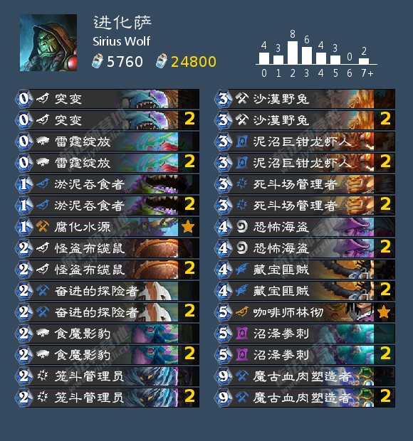 进化萨在新版本收获的最关键的单卡是笼斗管理员,这张2费抽刀可以**提高沼泽拳刺上手的概率,让我们完全围绕沼泽拳刺来展开构筑。恐怖海盗和藏宝匪贼都是配合沼泽拳刺非常强力的单卡。