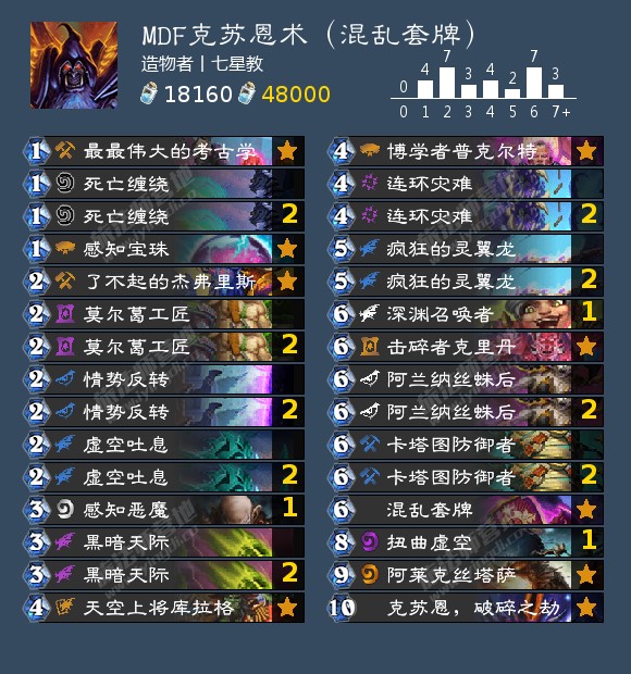 在这里放出的两套卡组中,我个人认为可能比较强的是克苏恩术,因为套牌中所具有的5费曲线会更多,更好完成腐蚀。而且配合术士高效的过牌体系,比较慢速的克苏恩或许可以成为术士较好的终结手段,而且由于卡位更多了,也让调整的空间变多了。