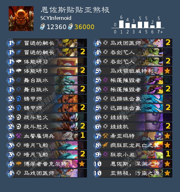 先看一下随从类型:①元素:希亚马特,②机械:暗月飞船、娃娃机,③海盗:冒进的艇长、吞剑艺人,④龙:帐篷摧毁者、疯狂巨龙死亡之翼,⑤野兽:迅蹄珠齿象;此外,体能演习里有机会开到一些有种族的随从,例如鱼人飞骑、角鹰兽等。恩佐斯,深渊之神可以压出一场虽然不大但还算可以的场面。对于亚煞极,污染之源,我带上了大多数的腐蚀卡,没有携带大力士和恐怖增生体,因为这套牌其实曲线偏高,恐怖增生体并不是一个按费拍的随从,且对于打出亚煞极,污染之源的回合作用不大,而大力士可能会非常卡手,也不算好用。对于狂欢小丑,这卡是一个博取上限的梦想牌,由于是嘲讽,本身裸下也亏得不多(对比风暴之眼),到中期费满,墓地排列好了以后,如果打出博学者排列牌库,那可以在2-3回合内,进行场面的持续铺满施压,最完美的状态下是4波铺场(恩佐斯、小丑、亚煞极+小丑以外的衍生随从、小丑),是卡组致胜的方法。