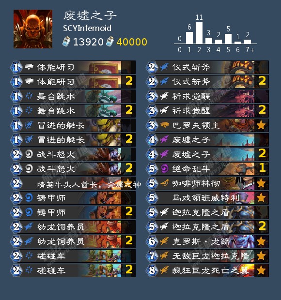 废墟之子是龙,因此马戏领班威特利继续可以加入卡组,这张卡的确是朴实无华的好卡。废墟之子是这套牌的核心,JK本人实际上只是工具人,不一定需要求满的JK,只需要两次来触发废墟之子即可,幼龙饲养员和咖啡师林彻是用来回收废墟之子的,达到真正的“举一反三”,一旦达成,大量的废墟之子可以让对手看不懂。