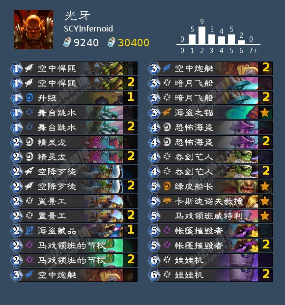 依旧先看一下随从类型:①机械:置景工、空中炮艇、暗月飞船、娃娃机,②海盗:吞剑艺人、空中悍匪、空降歹徒、恐怖海盗、吞剑艺人、绿皮船长,③龙:精灵龙、帐篷破坏者。