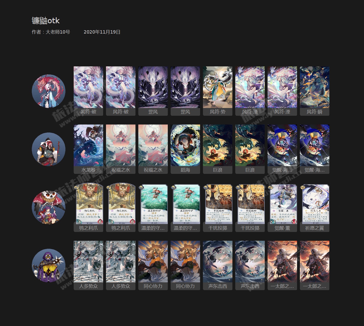 otk的核心,由于其目标只在完成3勾的otk斩杀,带牌思路以防守和加攻为主,又考虑到解场能力较弱,能量来源缺乏,于是选择了偏防守的带法。前期有机会就可以站场抢能量及血量,在有声东击西的情况下攻击力≥4的镰鼬很容易能骗掉对方的一次进攻和解掉一个后排,在这套几乎没有解后排手段的卡组理论上是必带卡。