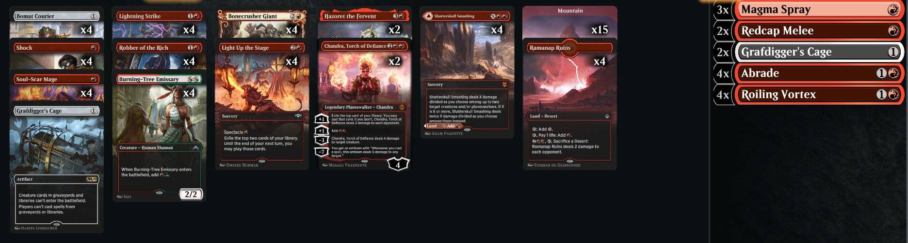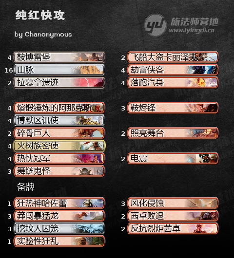 Chanonymous使用这套在Mythic_Society举办的史迹周赛上获得了4-0全胜。套牌相比于之前的纯红,主牌加入了来自KLR的讯使以及飞船大盗卡丽**。讯使**增强了纯红的续航能力,用过的都说Amazing!而卡丽**可以狠狠惩罚展开较慢的对手。备牌毋庸置疑加入了新的茜卓,进一步增强了和慢速套牌对抗时的续航能力。