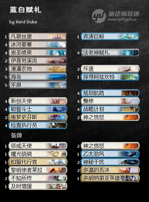 蓝白赋礼,是我这次重铸后最想玩的套牌之一。我很喜欢这种源源不断从坟场拉出强大生物的感觉,彷佛是带领着一批亡灵大军,一波一波永无尽头,从心理到生理战场都彻底压垮对手。