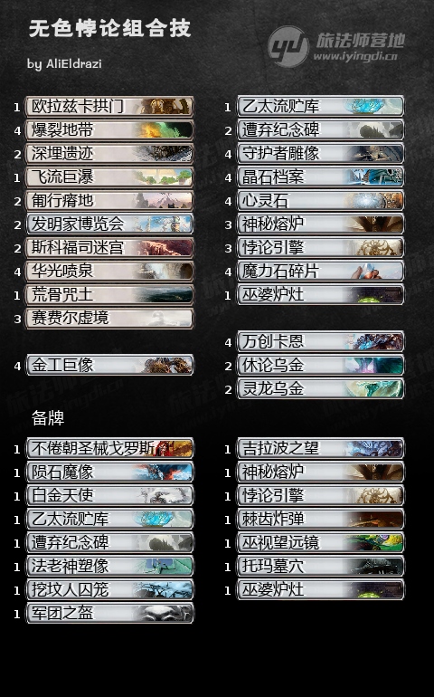 以上虽然听起来很激动人心,但可以看到这套其实只带了一个炉子,而真正的计划和之前并无两样,就是天胡。每回合下地同时下产费神器,准时拍出悖论引擎或者纪念碑,然后打出乌金,巨像或者卡恩找到的合适神器接管比赛。