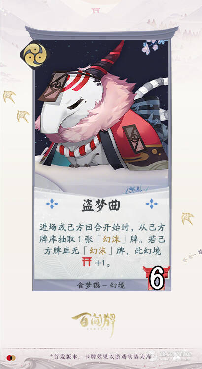 - 创作思路:貘传说中可以带来好运,结合“为崽而战”主题及官方“食梦貘”的特点,设计为标记己方牌库的式神。