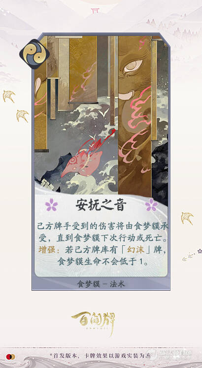 3勾SSR,强化己方的终结能力。效果类似薰的SSR,使用此牌后,本回合及以后回合都会生效。“对应效果作用于除食梦貘外的其他全部己方式神”意味着只要回合内抽到【幻沫】卡,其他己方式神都会获得连击和造成伤害吸血。