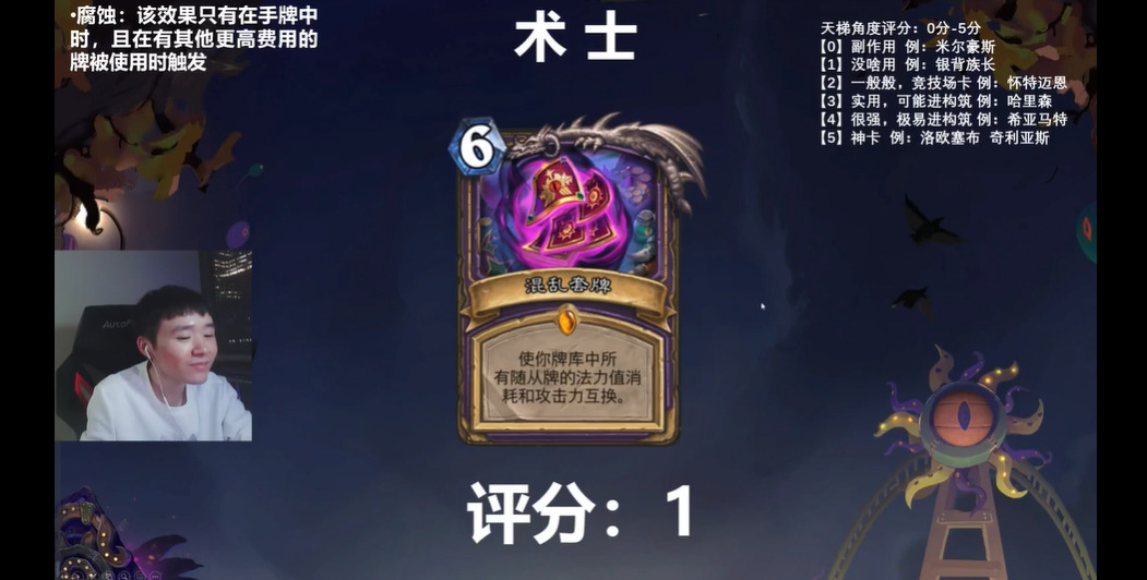小结:异灵术老师认为撕5张没有大众想的那么厉害,只能说很有趣。奶粉给提克特斯打了4分认为强度还可以,但是慢速卡组厉害不起来,而且狂野环境一定是以快攻或组合技为主导的,这类牌的价值比较低。 值得一提的是两人对连环灾难的看法都还不错,4费也不高,认为这是很有可能进慢速术士构筑的牌。在新版本宇宙术的构筑方面,奶粉比较看好奥秘法的发挥,能带奥秘吞噬者的卡组都可以带着,然后就是连环灾难可以考虑携带,包括混乱套牌、新四大古神在内的这些牌都没有必要携带的,提克特斯看环境携带。