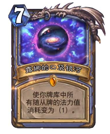 ② 和露娜的口袋银河比较实在是差了太多,现在狂野7费的口袋银河已经算是比较娱乐的牌了,也是在有始祖龟朝圣者检索的情况下宇宙法也不入流。而且口袋是减到1费,有观星者露娜、巫师学徒、以前的咒术师的召唤等等极高上限的配合,以前法师开口袋经常可以1、2个回合内就完全拉回节奏,尤其是存在研发计划、奥术智慧等爆发性的过牌。