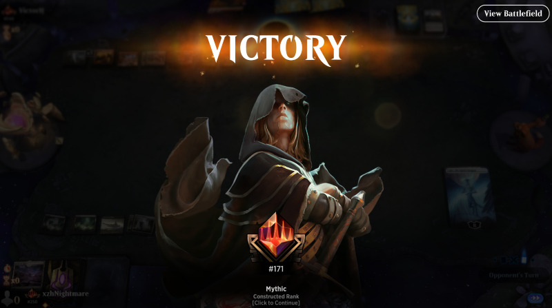 我们不是太怕对手的5回合乌金,反而是主牌的4张神器解让遭弃纪念碑很难受,不过这个对局中死灵惧相就是一锤定音的存在。天梯上可能是被艾斯波末日打没了,所以没有遇见过。