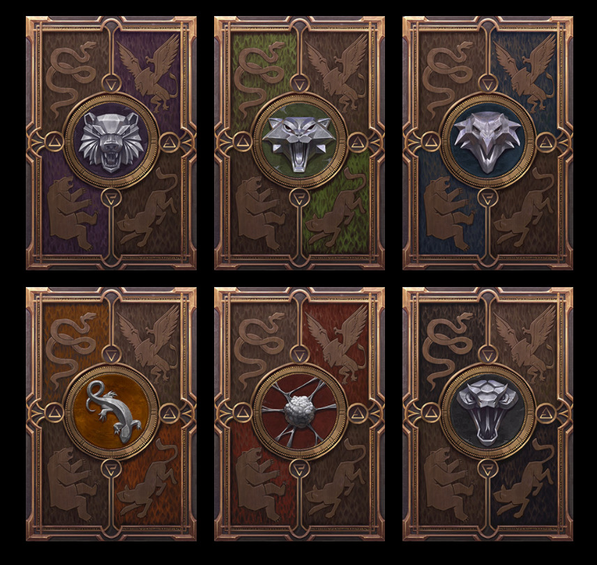 这次扩展的主题是猎魔人之道,官网也放出了这次出现的猎魔人学派及其他阵营的卡背和格言,根据颜色,所有学派的对应关系如下: