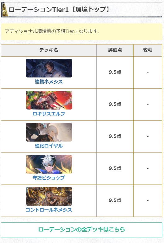 今天是DLC版本的第一天。日本攻略网站Gamewith给出了一个预测的DLC后T位表,T1卡组全部都是DLC前的T1,可以看出Gamewith相关人员对于新环境的悲观预测。