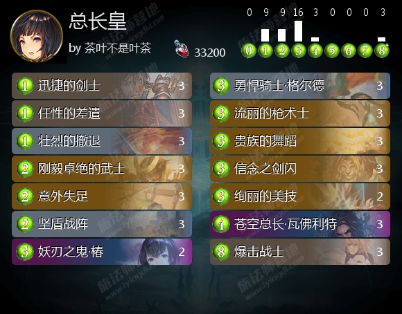这套牌的核心思路就是靠苍空总长·瓦佛利特的效果反复buff牌库中的迅捷的剑士和刚毅卓绝的武士,然后用爆能强化过的贵族的舞蹈召唤出这两个身材巨大的疾走随从完成高额斩杀。