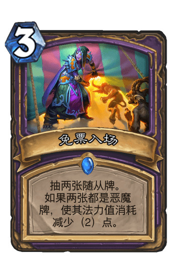 新卡加强了这套牌。这套牌只有三个随从不是恶魔,所以免票入场可以3费抽两张减费(有类似头颅的效果,过牌却不亏节奏)。摇滚堕落者也是非常强的一张卡,可以斩杀,回血,战场,弥补了上版本黑眼术有时候铺了很多但是自己没血的尴尬。邪恶低语全场BUFF可以补伤害或者让怪脱离解牌范围。癫狂的游客也是有配合时不错的恶魔。