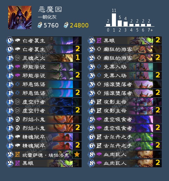 大家好,我是一朝化灰#5744,新版本第一天我用恶魔园76分钟从1600打到了600(14场71胜率),现在已经打到了371名(目前27场74胜率),所以想和大家分享这套卡组。
