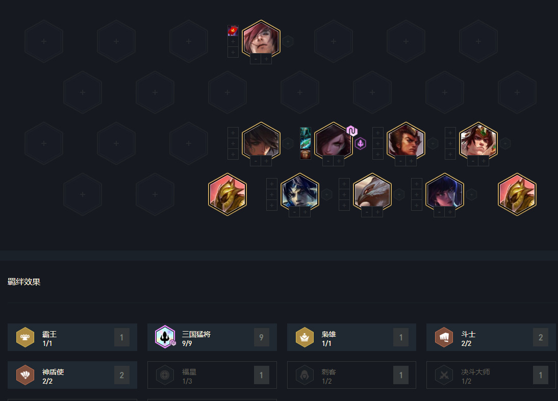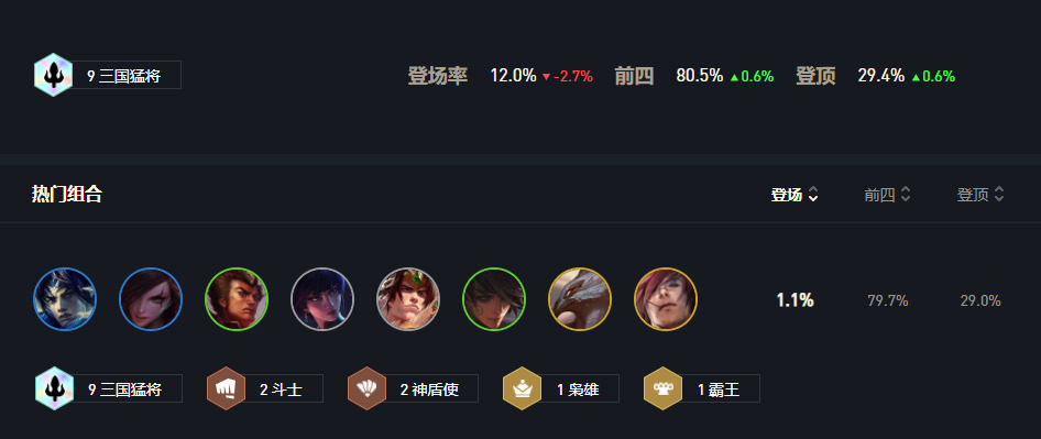 上图为9三国统计数据,这里面还有别的思路三国的玩法,但阵容成型后强度超高。
