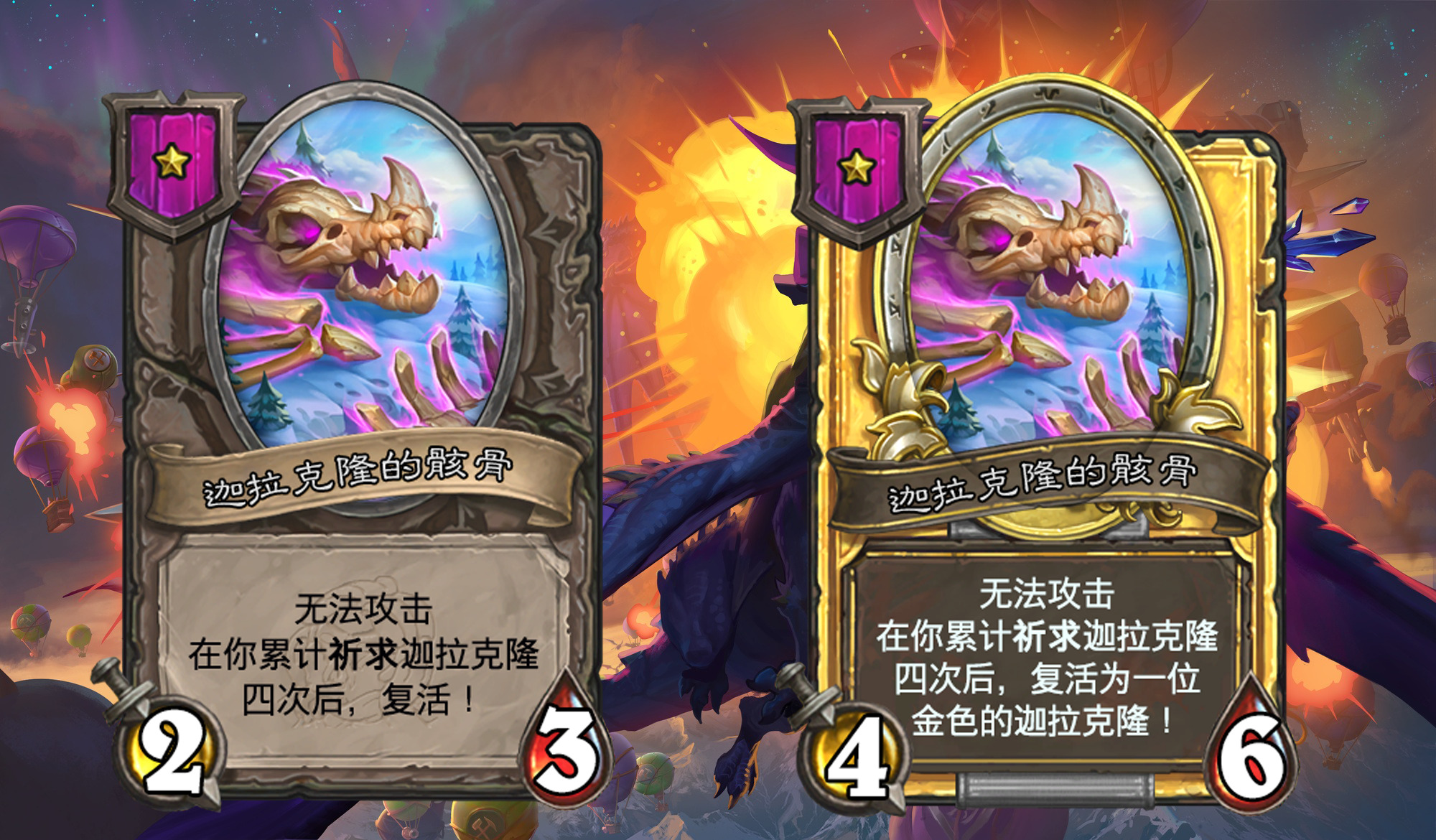 瞧,这是迦拉克隆的骸骨,在我们的信徒不断祈求它后,庞大的迦拉克隆便会降临,并以40点的生命值帮助我们消灭任何敌人,当然,他不会允许信徒信仰其他巨龙,他会不屑地摧毁你的酒馆里的所有剩余骸骨。