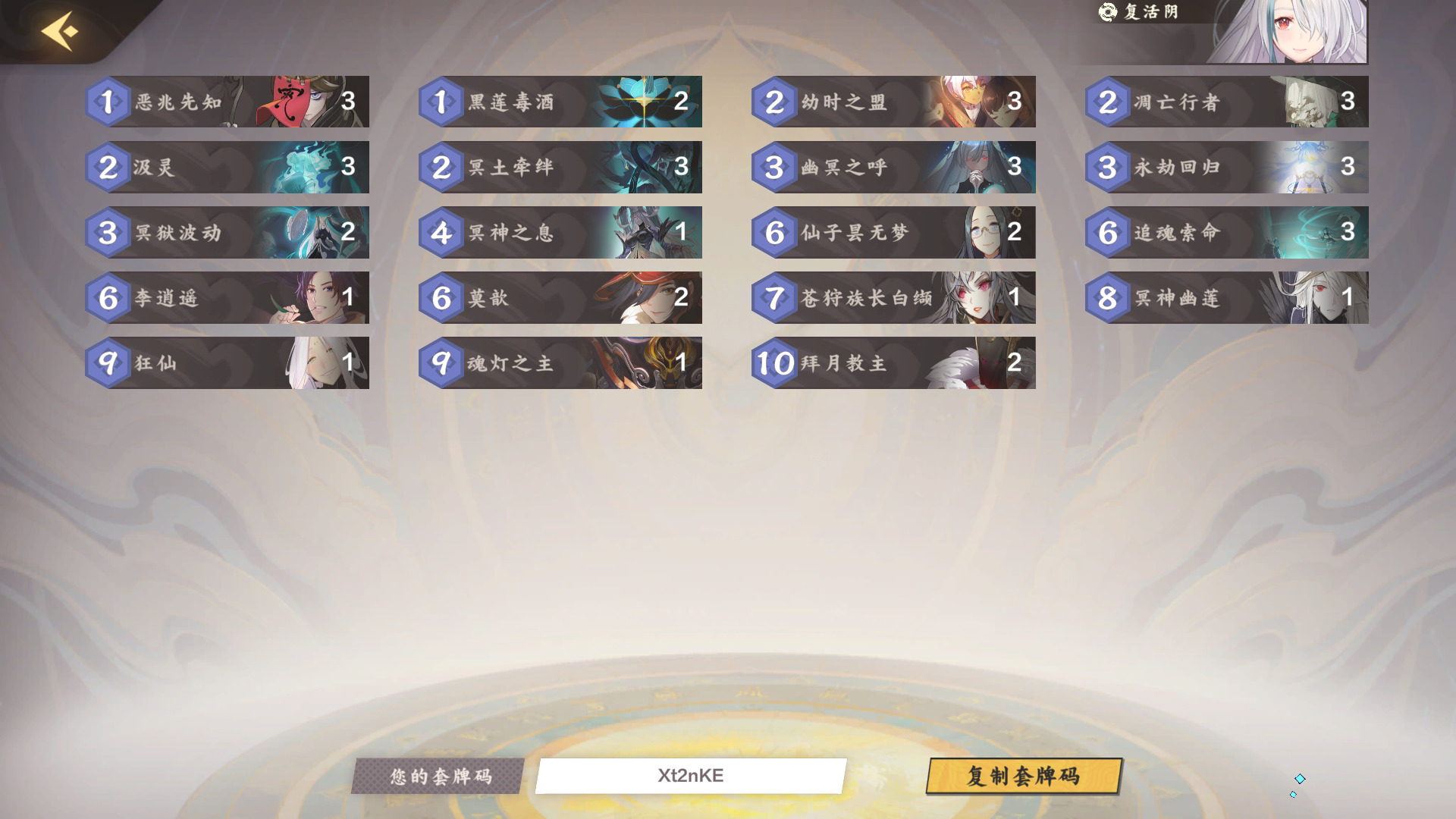 【卡组概述】:面对快攻,有着冥土牵绊以及冥狱波动两张好卡来进行针对,同时凋亡行者可以有效消灭敌方的关键生物耀灵军策士(偶尔会砍到繁世孤雏),奶量拉满可以有效防止在己方返场之后被直伤斩杀,同时复活阴因为其职业特性,几乎不输除了法术雷/中速火之外的其他所有职业,但是在面对法术雷和中速火时几乎毫无还手之力。(所以那俩是不是该削了?)