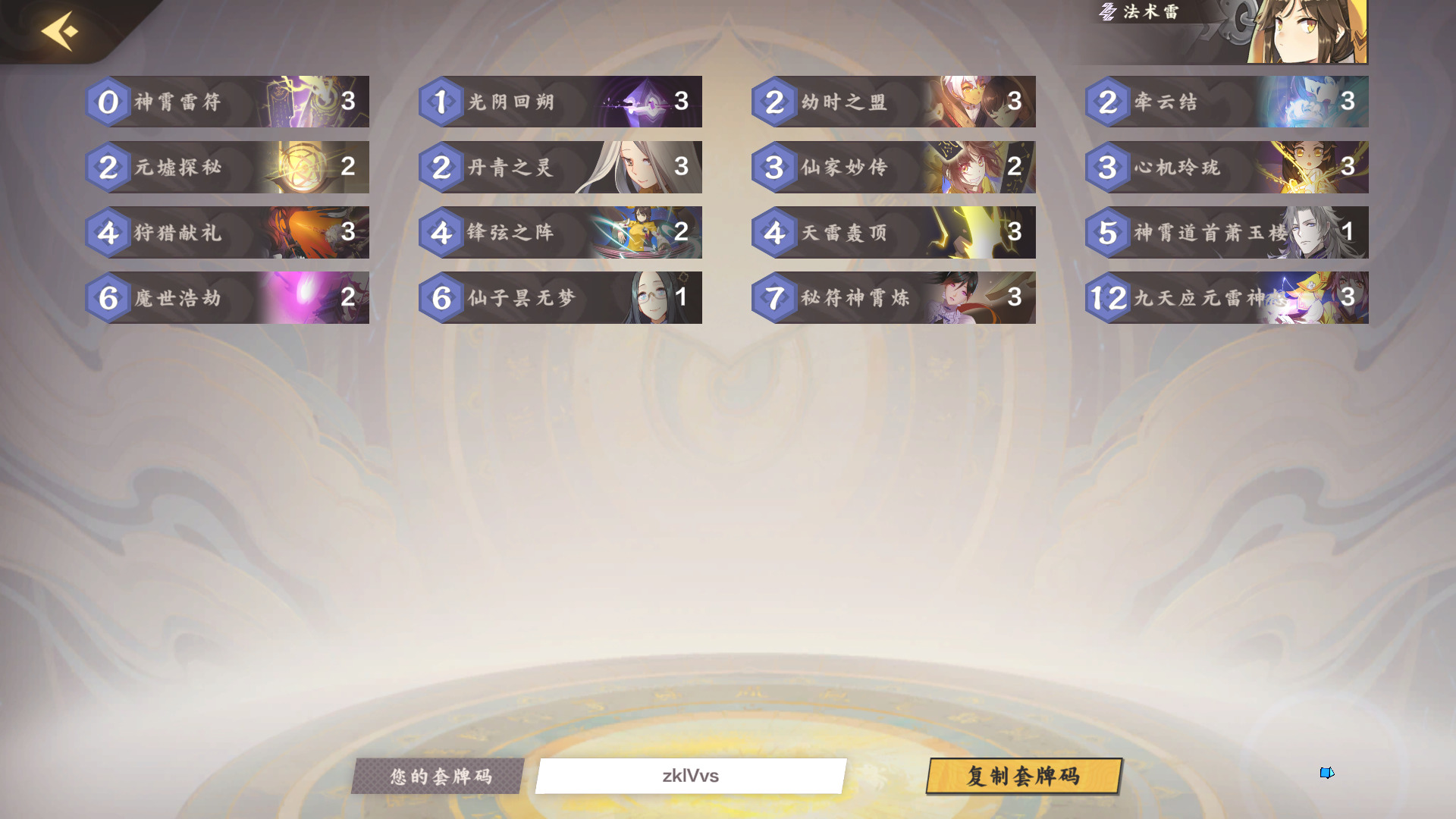 【卡组概述】:面对节奏阴,只需要解场刷法术即可,节奏阴的场面很小,续航较强,威胁较低,远不如中速火给到的压力大。面对复活阴,主要依赖秘符神霄炼控制对方的大哥,复活阴的生物很少,启动很慢,有足够的时间去给雷启动的时间,阴如果用怪格挡秘符神霄炼,则会导致抓过去的怪死在朱寒樱的墓地无法复活。如果不去格挡任由秘符抓过去的怪走脸,则会导致血线被压低进入斩杀线(甚至可以用魔世浩劫将抓过去的怪杀死在自己墓地)。同时因为阴对金的极限克制,金属性数量大幅度减少,法术雷的天敌减少之后,更加肆无忌惮,可以大幅度减少抗快攻组件(辉骨之刺/锋弦之阵等),反正遇到快攻大概率还是输,不如大幅度增加对优势职业的胜率(反正快攻就一个职业)。