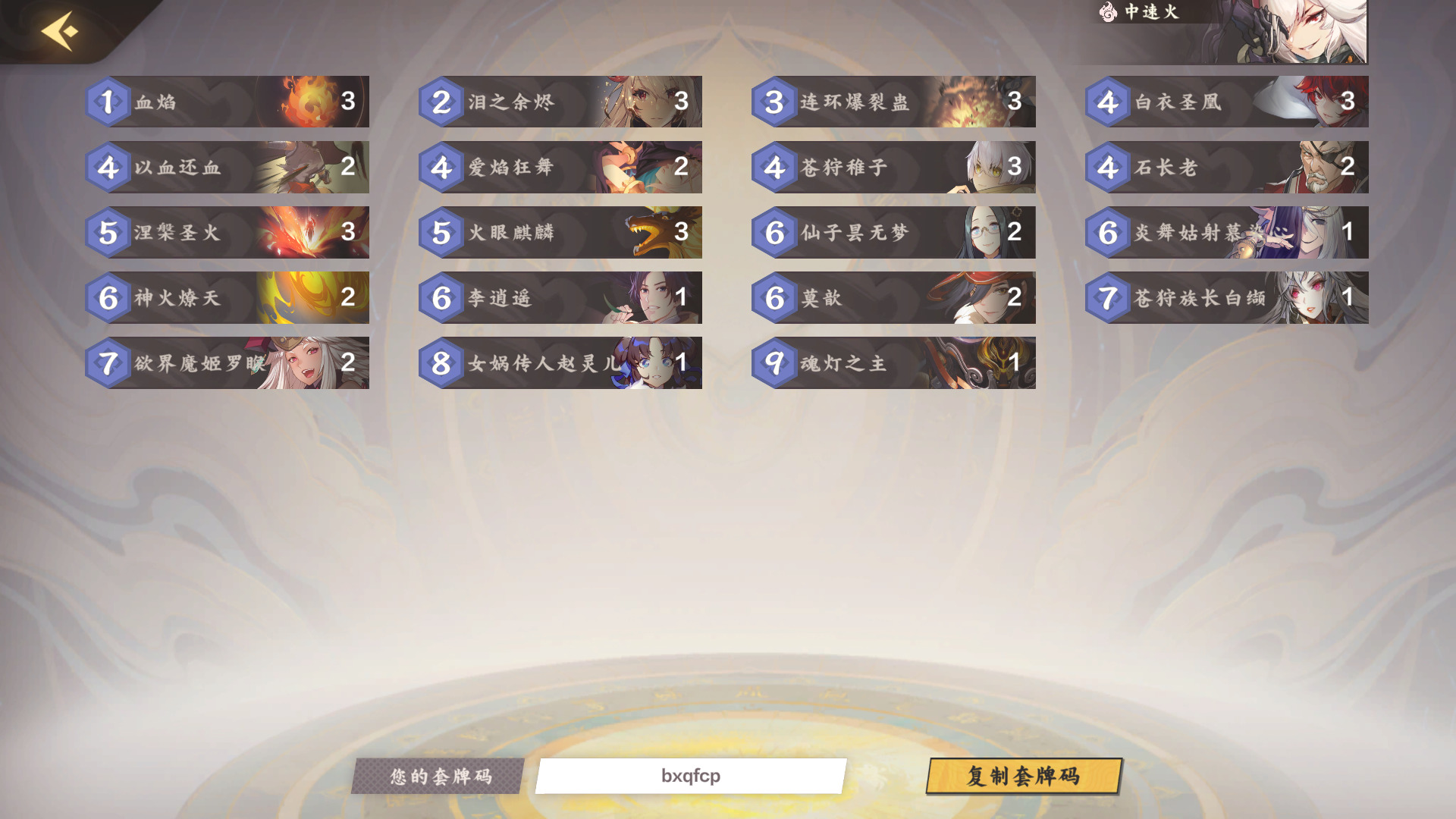 【卡组概述】:面对节奏阴,基本是给火送分的。面对复活阴,满编的苍狩稚子以及两张莫歆,几乎可以打的复活阴毫无脾气,同时捏好技能,对准“仙子昙无梦”、“冥神幽莲”等复活阴对抗火的关键卡,复活阴将会被打的毫无脾气。面对法术雷可以着力于复制罗睺、李逍遥等威胁较大的生物,虽然会被版本之子法术雷克制,但是可以有效的针对除法术雷外几乎所有职业,尤其是各种对幽莲感兴趣的玩家,以及玩幽莲被法术雷打自闭后试图换耀灵军去复仇的玩家(于是他们最终都加入的法术雷)