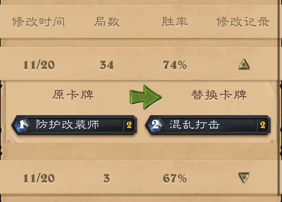 有人名人说过:改了一张,这个卡组就是我的了。本着这个思想,我改了两张卡,更加的自信!原卡组作者并不是我。本人不是很喜欢用铲车人(防护改装师),这个卡组大部分怪都是一二血的,贴不了圣盾,只能补刀,后期还容易鬼抽,于是我换成了混乱打击,提高了斩杀线和补刀能力。虽然增加了踩高跷的触发难度,但是对于我这种踩高跷接空翻杂技/凯恩·日怒的老倒霉蛋来说问题不大。可替换单卡: