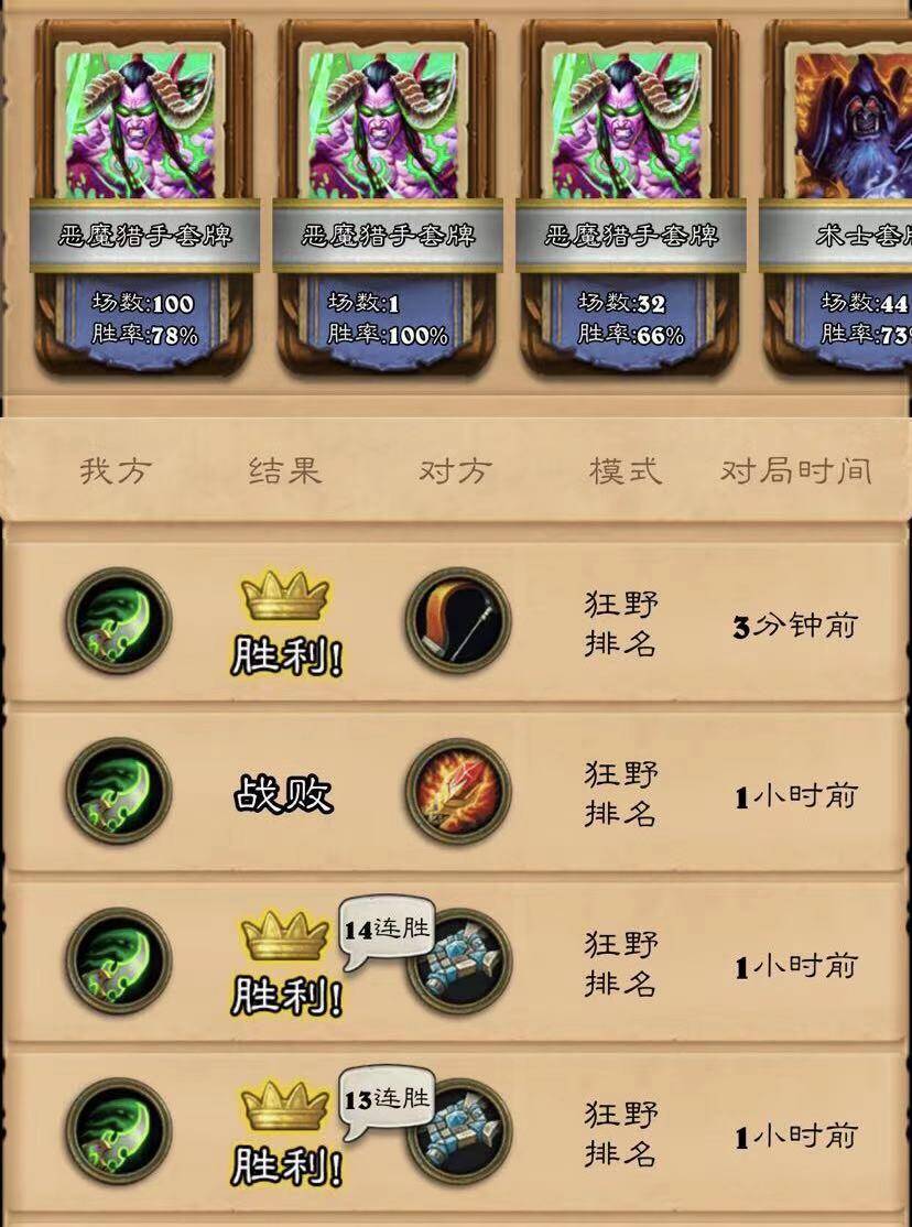 一时兴起码了这篇文章,卡组大部分都是蓝白卡,凯恩应该你们也有吧,就是肉疼要合高跷艺人了。其实34场的对局确实场次少了不少,但给了我当年奇数瞎的感觉,上了传说之后又打了十多把,50把胜率稳定在七十左右,对阵天梯大户德贼骑具有一定优势。我相信快攻瞎定能在标准引起一番腥风血雨,重归恶魔猎手的荣光。最后100场78胜奇数瞎镇楼!