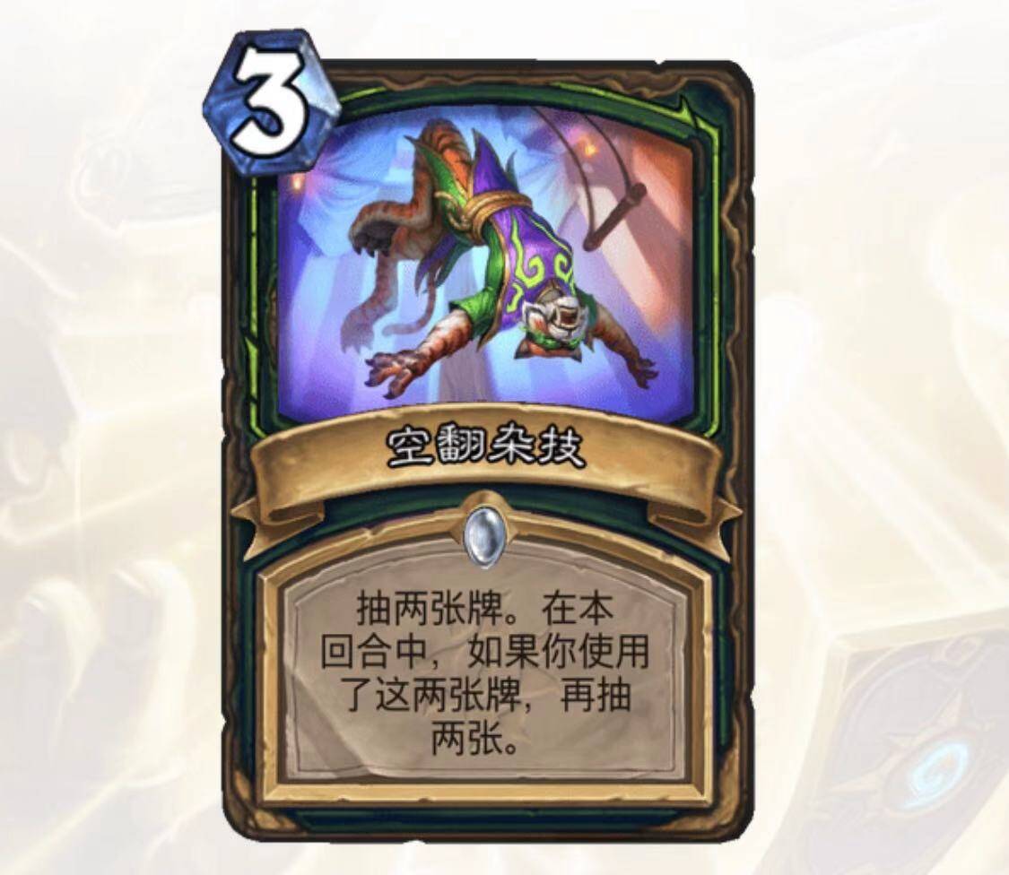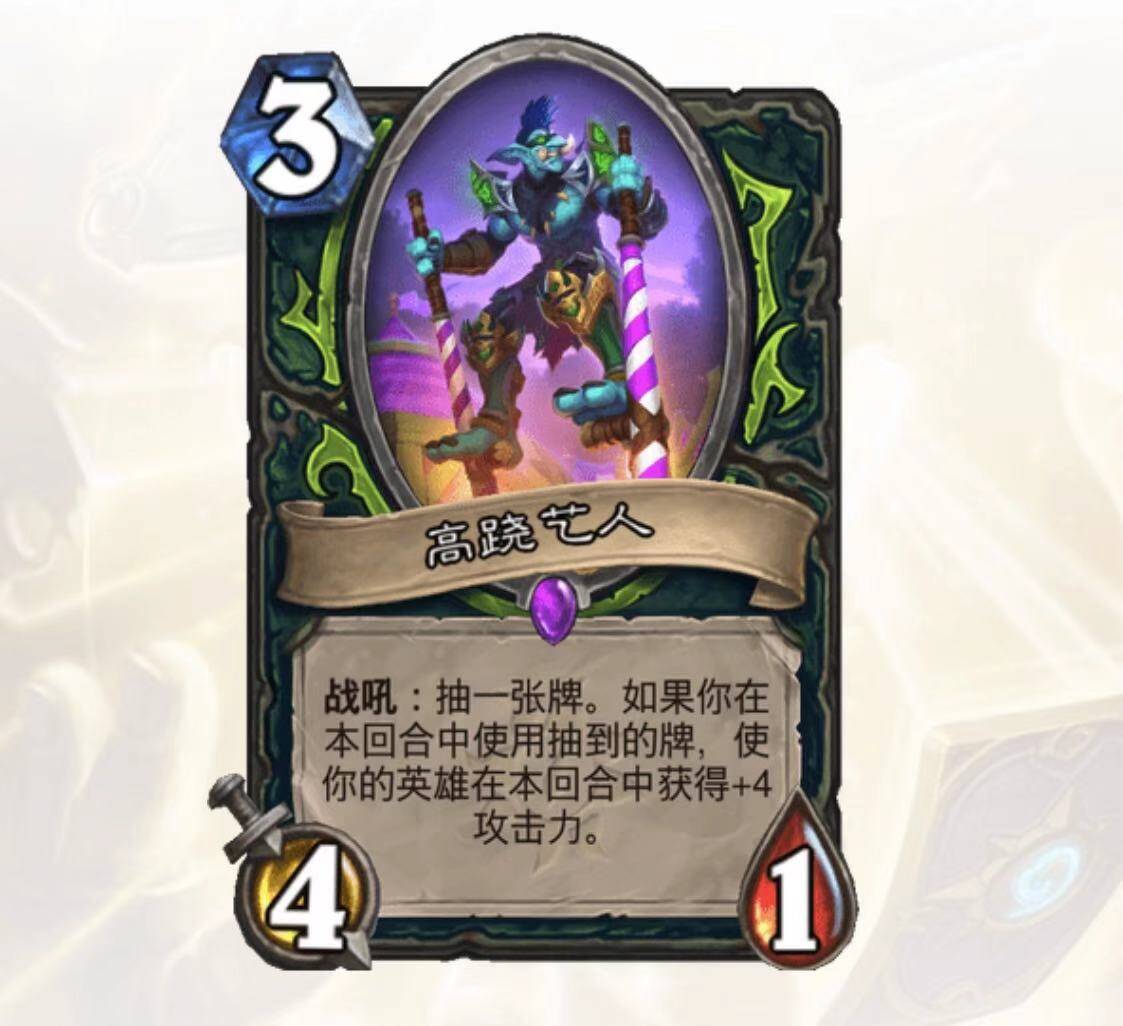 特化低费构筑的原因,站场+过牌+伤害 完美的快攻单卡,成功触发特效**加速抢血进度或者解怪保护场面,就算没触发也是341过一张牌,勉强接受。高跷艺人过高跷艺人过双刃斩击7费炎爆梦幻combo您不想试试吗?