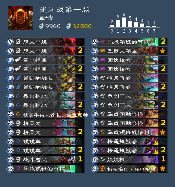 从构筑上来说鱼天冬大佬构筑的相当丝滑,对局中基本是按费拍怪还能顺便解个场。唯一的思考点可能就是猜奥秘了。作为一套原创卡组,目前天梯上用的人不多也是一大优势,目前其他职业的情况相对明朗,其他玩家对战士的留牌很可能因为信息差出错。这方面我们可以吃一波版本红利。