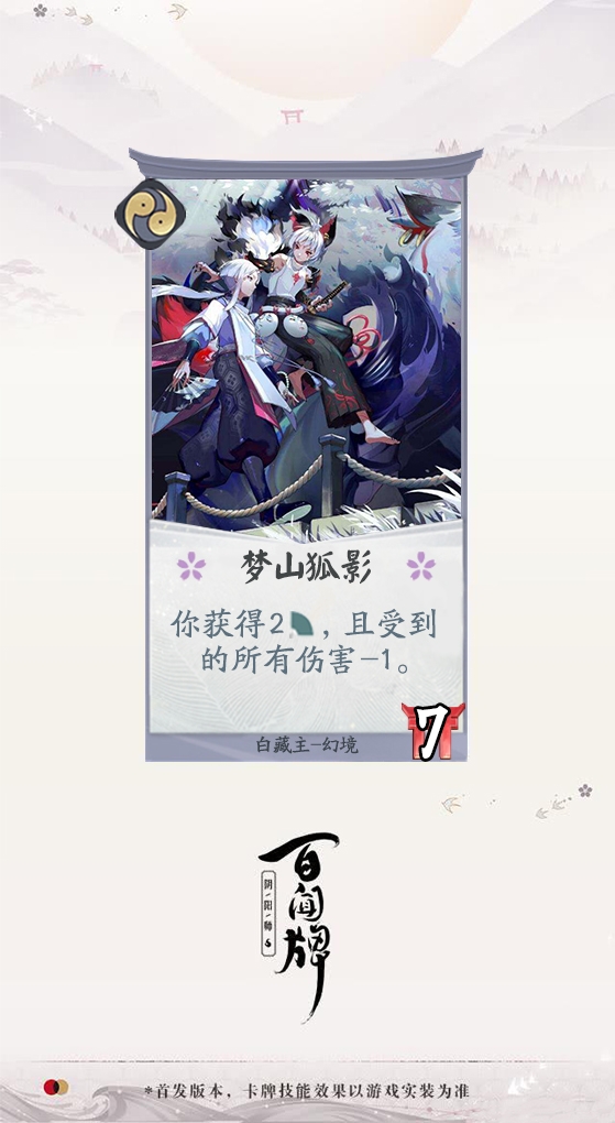 神卡。简单粗暴,2攻击1免伤,花鸦刀哭了。放两张下去就能豁免大部分伤害,牌手还是5攻击力打底,快攻基本绝望。就算是大身材的犬神酒吞三目跳哥也难以对付。并且,就算白藏主气绝,由于这张牌是幻境,加攻免伤的效果仍然存在,而牌手也只是不能出击但仍可以反击。