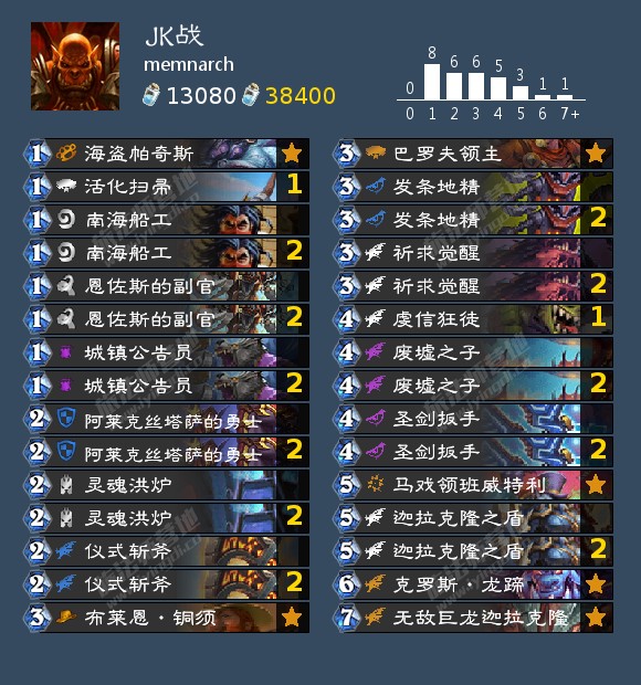 这是memnarch美服第九的一套JK战。在尝试新卡组的潮流过后,很多玩家发现还是宇宙牧强,天梯里的宇宙牧也渐渐多了起来,而携带炸弹体系的JK战打宇宙牧是个大优势对局,对上别的对局也丝毫不虚,使用者在宇宙牧众多的美服打出的成绩也证明了JK战实际强度并不差。