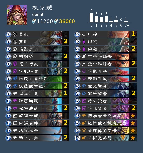 来自donut 的一套机克贼,他以38场66%的胜率打上了传说。构筑上带上了九张0费牌,方便快速倾泻手牌,手感极其丝滑。 卡组满编了闪避和暗影斗篷,可以帮助我们拖四个回合,行骗也进一步提高了我们都过牌效率。