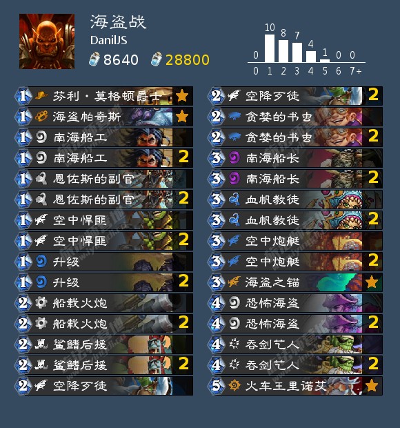 这是DanilJS欧服传说25名的一套海盗战。乍一看这套海盗战只有两张吞剑艺人是新卡,但海盗战的基本框架已经算很成形了,也并不需要太多补强,其他新卡也并不太适合海盗战。吞剑艺人4费2/5嘲讽还挂一把刀实在是太超模,朴实无华的强卡。
