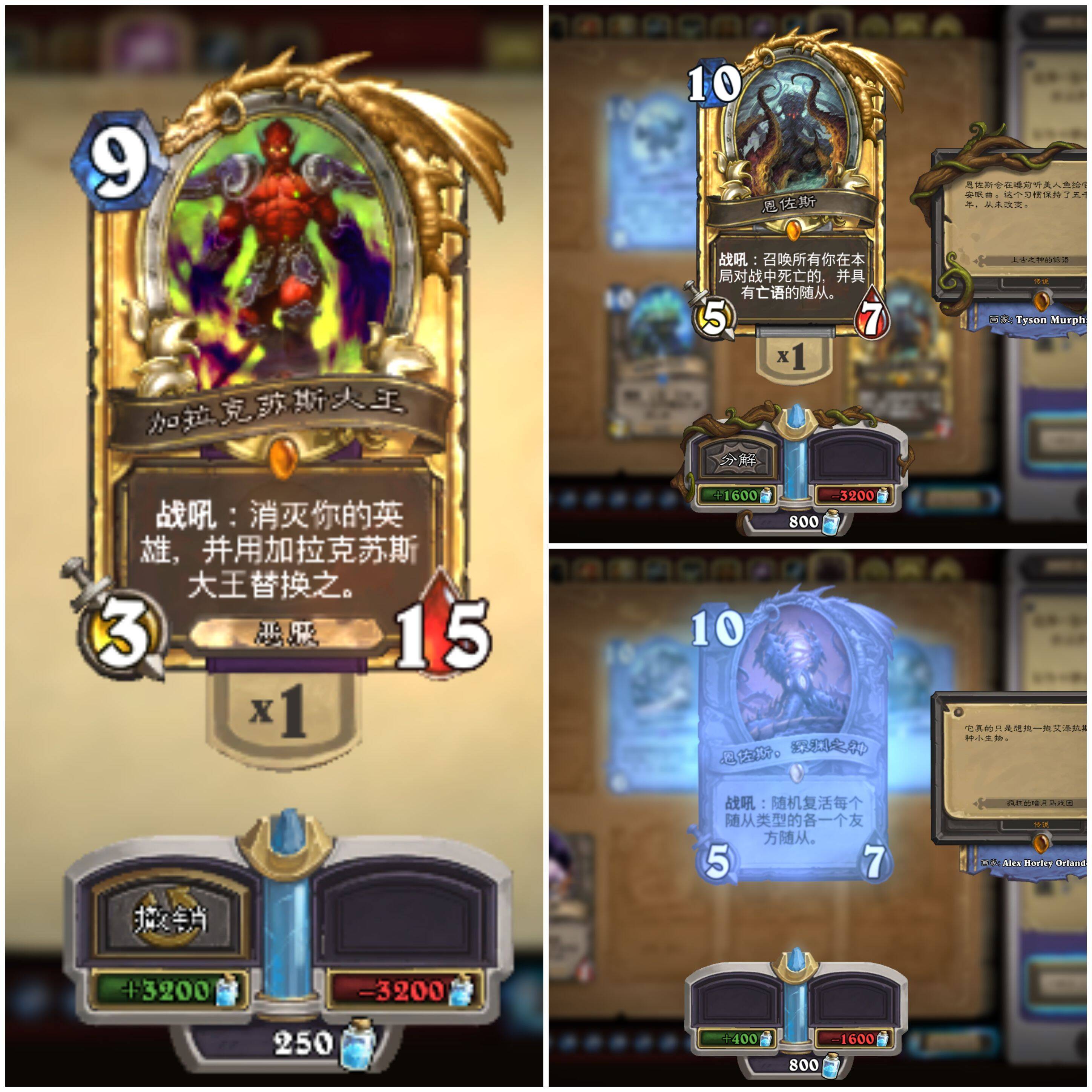 机械加拉克苏斯,我一直没查阅到相关文献讲他和加拉克苏斯大王什么关系,但从零零碎碎的信息以及阿兰娜的冒险章节,感觉他俩区别不大。不管怎么,加拉克苏斯大王是设计很新颖的卡牌,虽说老师说过这张牌不改改没法用的,不过我还是舍不得分解他。另外一位就是”千须之神“恩佐斯啦,当然马戏团版本将其封为深渊之神,也不错嘛,反正都喜欢低语,逼逼叨叨的,克苏鲁信奉者狂喜。
