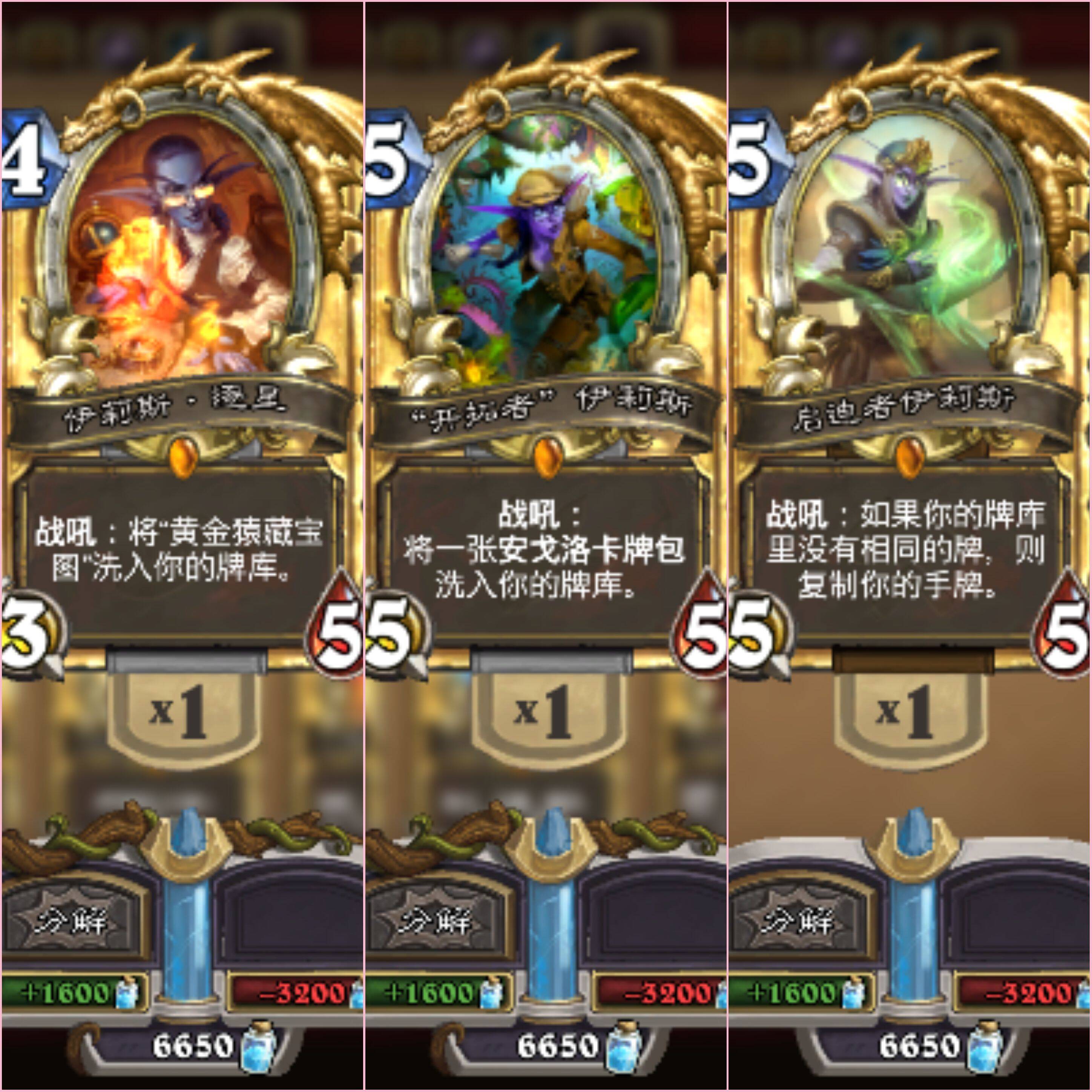 大部分玩家眼里,伊莉斯称得上是炉石传说塑造最好的原创英雄,她降临炉间化身的卡牌有如下三张:基于时间从左至右分别是探险者协会版本的伊莉斯·逐星、安戈洛版本的”开拓者“伊莉斯以及奥丹姆版本的启迪者伊莉斯。