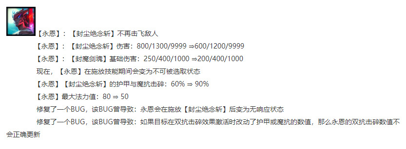 最大的提升就是永恩技能击碎护甲与魔抗从60%增强到90%,,无论敌方多肉被永恩技能打到也会变为脆皮,削弱90%护甲与魔抗近乎等于真实伤害了。最最重要的一点这击碎护甲与魔抗是持续到回合结束的!