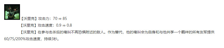狼人得技能改动:狼人参与击杀后为自身与所有同羁绊棋子提供额外攻速持续3S(参与击杀:包括击杀与助攻,也就是说只要狼人对敌方的棋子造成伤害了就算参与击杀,装备也算)。