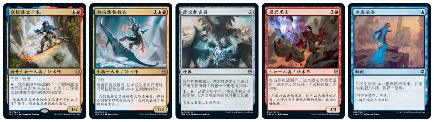 红色有很多双色牌,如果你抓到塑世灵菲拉斯,可以考虑定色或混色,非常的强。狂搅逐客卡札和乌玛拉秘教徒是蓝红法师的打法(偏中速),其余偏快攻和战士打法。